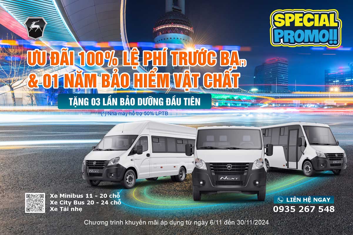 - Tặng ngay 50% lệ phí trước bạ và 01 năm bảo hiểm vật chất toàn bộ xe cho khách hàng mua các dòng xe Gaz Minibus, City Bus và Tải nhẹ.